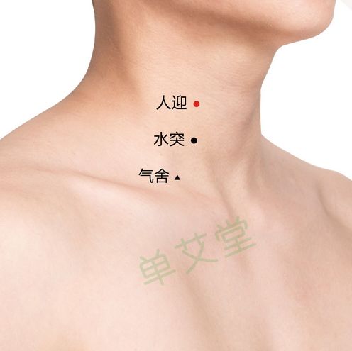 人迎穴位置:在颈部,喉结旁,当胸锁乳突肌的前缘,颈总动脉搏动处。