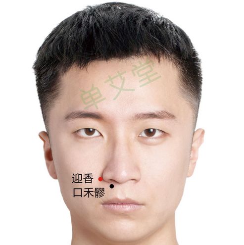 迎香穴位置:在鼻翼外缘中点旁,当鼻唇沟中。