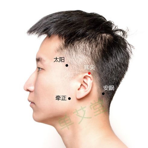 太阳穴位置:正坐或侧伏坐位。在颞部,当眉梢与目外眦之间,向后约1横指的凹陷处。