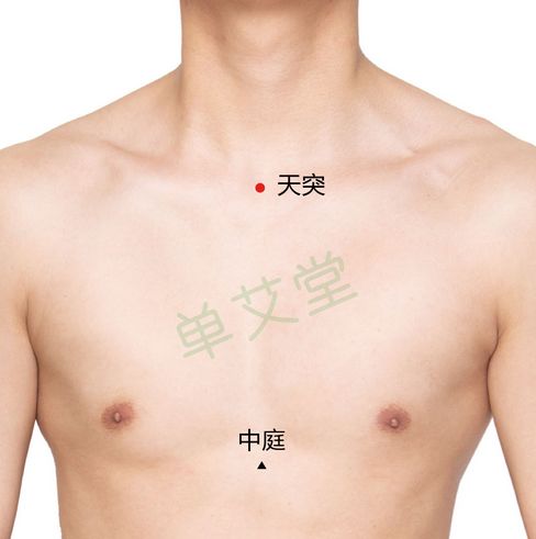 天突穴位置:仰靠坐位。在颈部,当前正中线上,胸骨上窝中央。