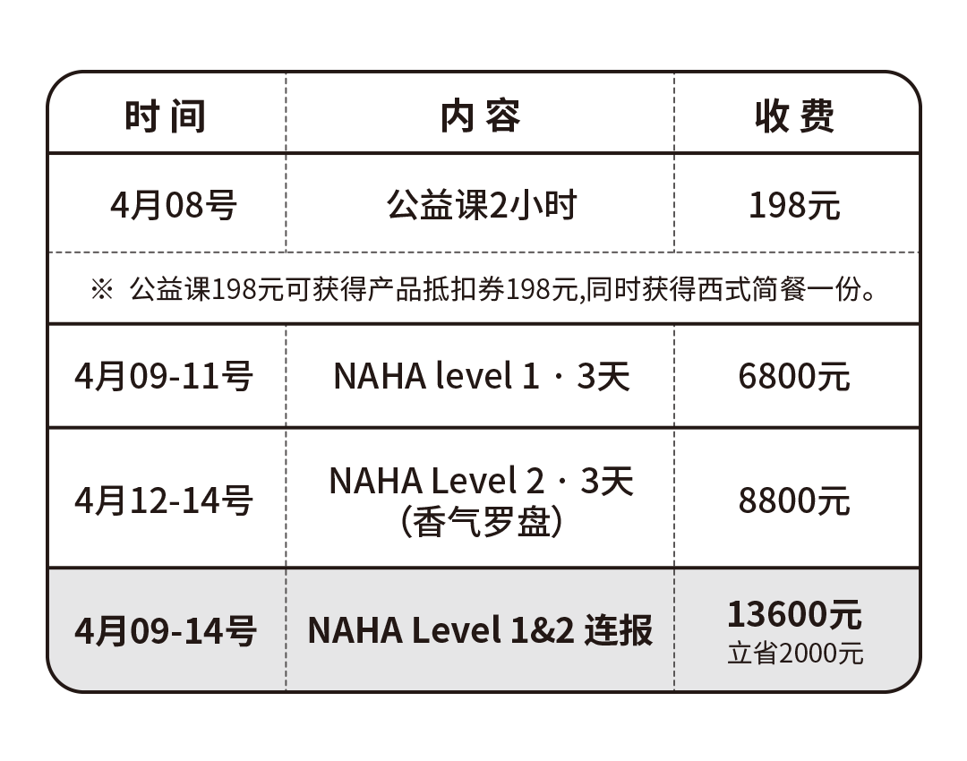 ●NAHA Level 2是在此基础上的进阶或者说是细分,比如说这一次我们就会把其中香气与情绪的部分单独拿出来,做一个为期3天的模块:香气罗盘。