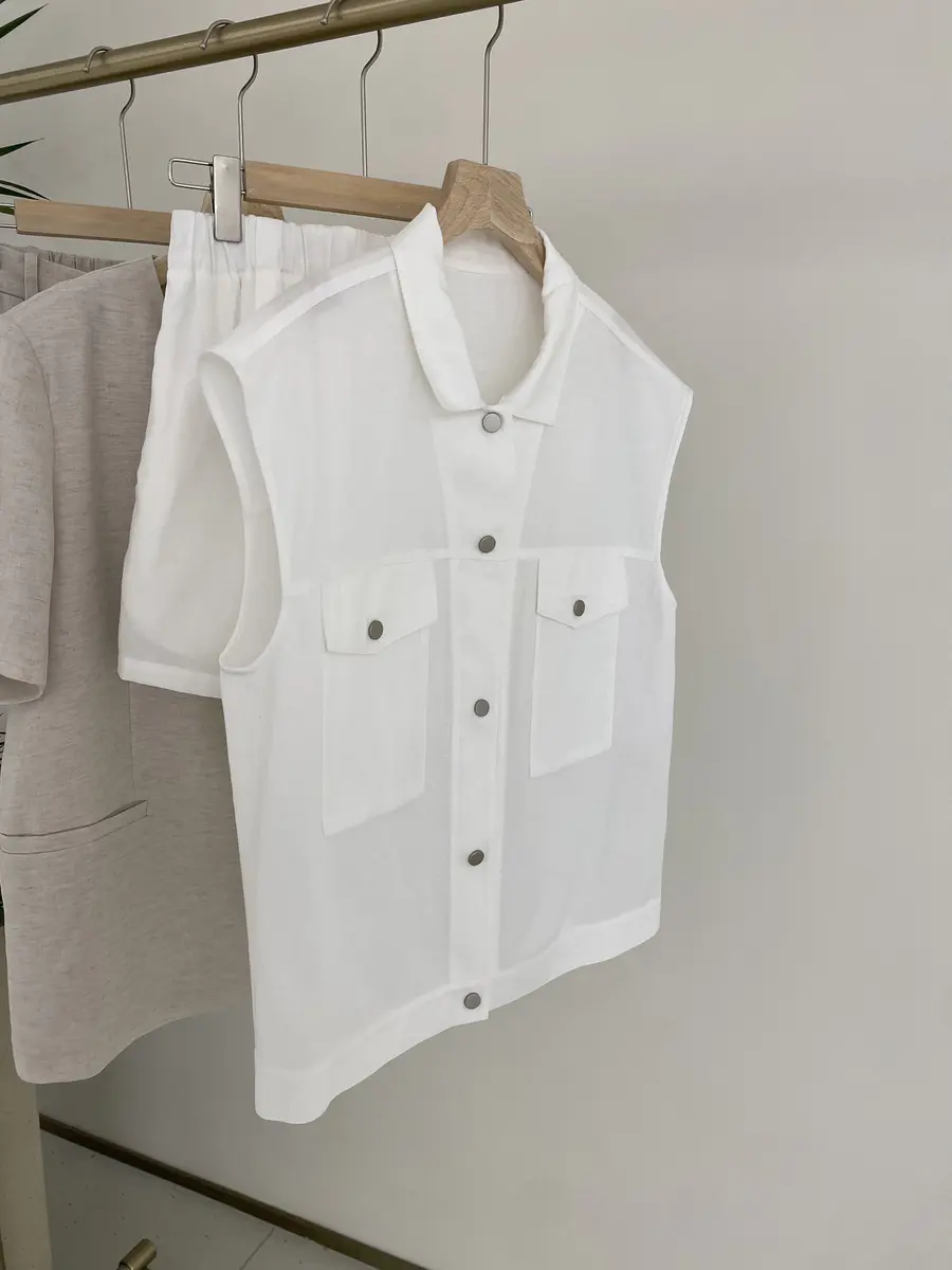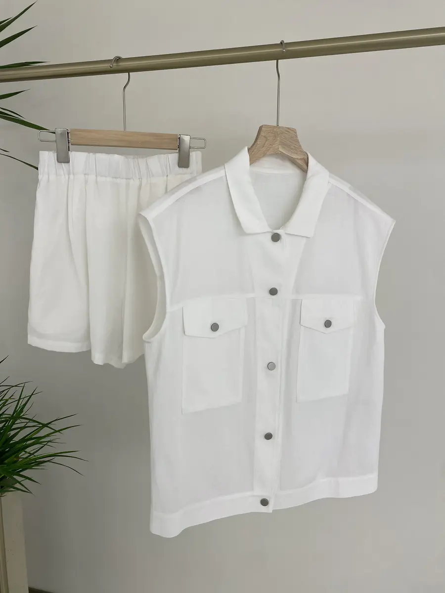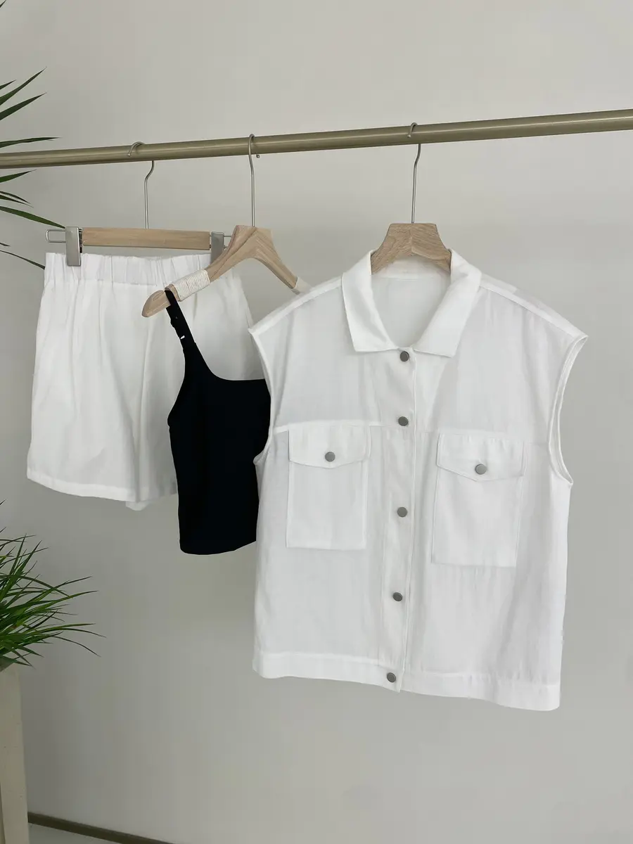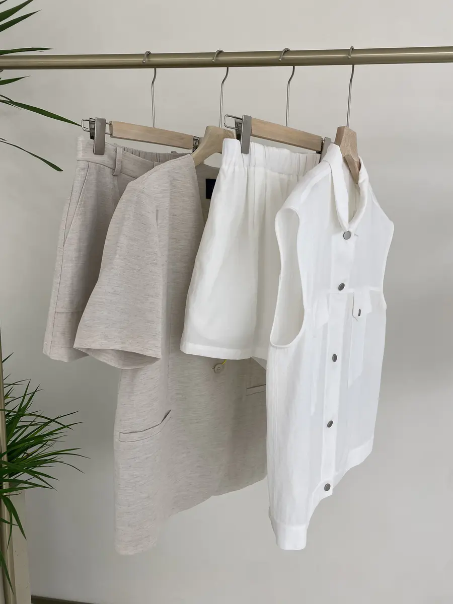 白色套装偏日常工装风,采用小马甲搭配短裤设计,自带松弛感,日常出街也不会过于正式~