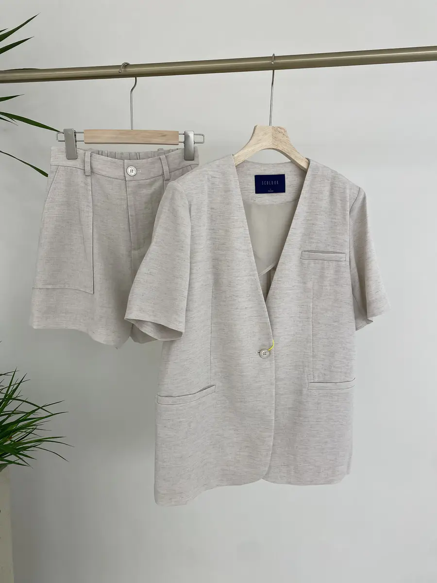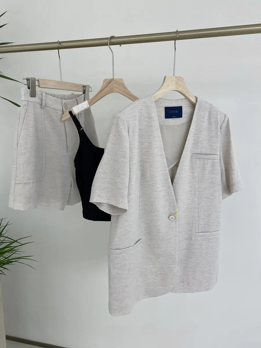 卡其色套装偏休闲西装风,无领设计反而多了份时尚休闲,搭配西装短裤,正式场合直接一套抓~