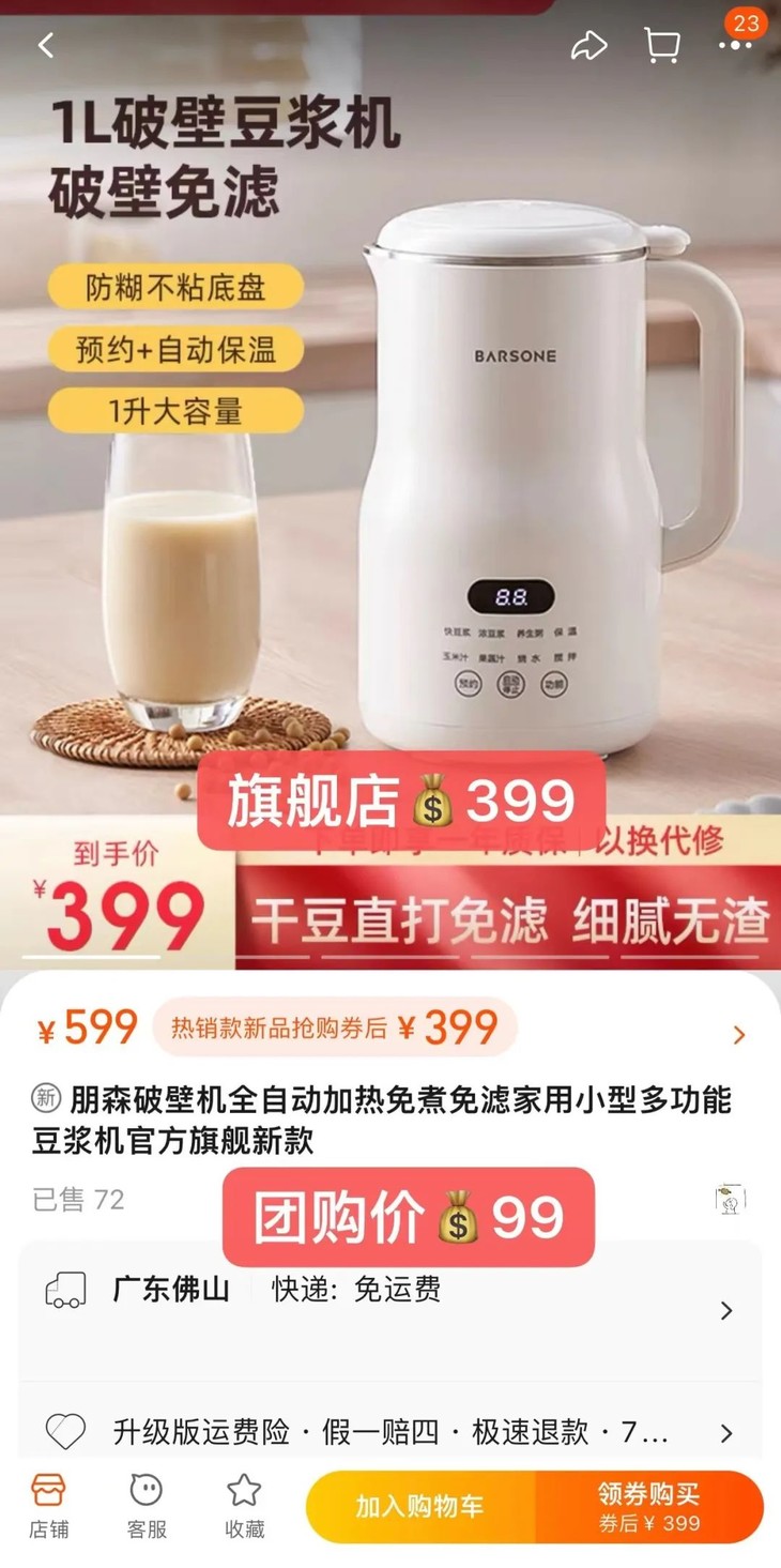 所以也就有了这次的活动,¥99一台豆浆机的神奇离谱价格!