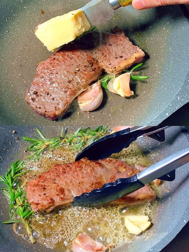 另外,黄油(烟点是120-150摄氏度)是可以用,但是不是在开锅的时候用,而是在你把牛排的两面都煎至焦褐了。最后阶段,离火再加上黄油,用勺子浇淋的方式使牛排裹上一层黄油,作用是使得牛排的奶香味加分。一般四爷的牛排都不需要加黄油,因为四爷主推的产品基本都是谷饲牛排,谷饲牛排的油脂丰富,奶香味足,实在太稥了!