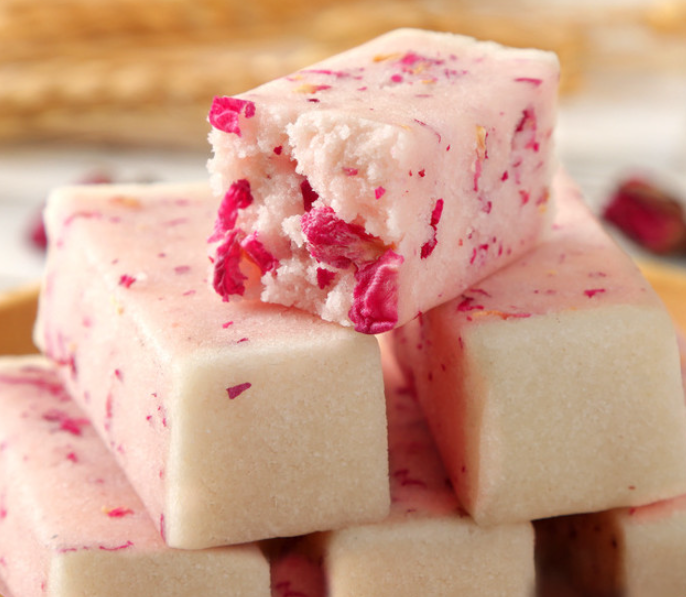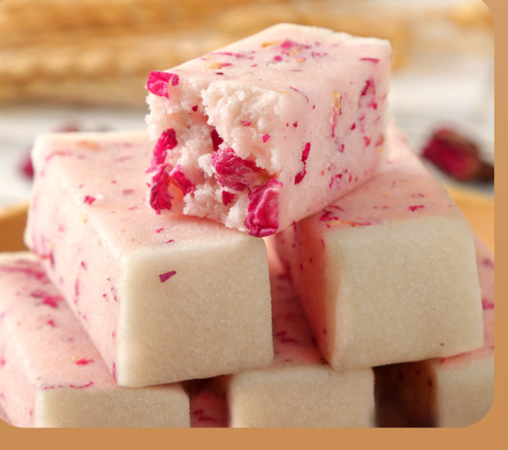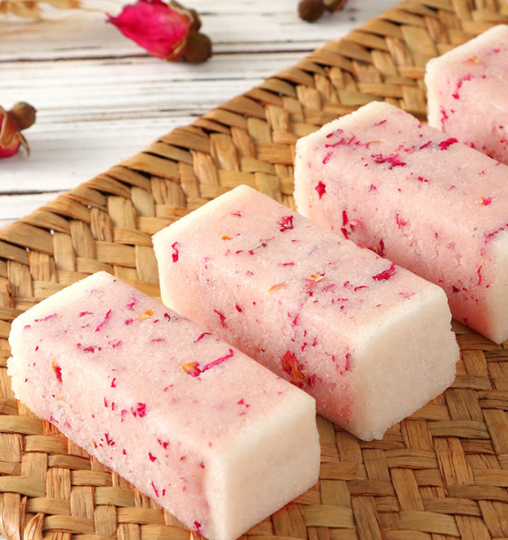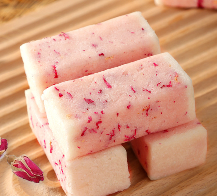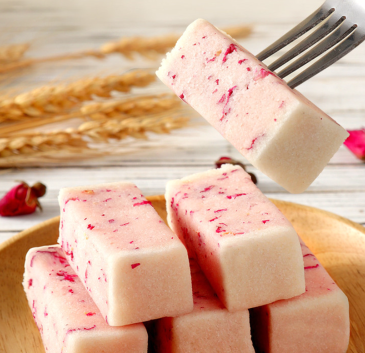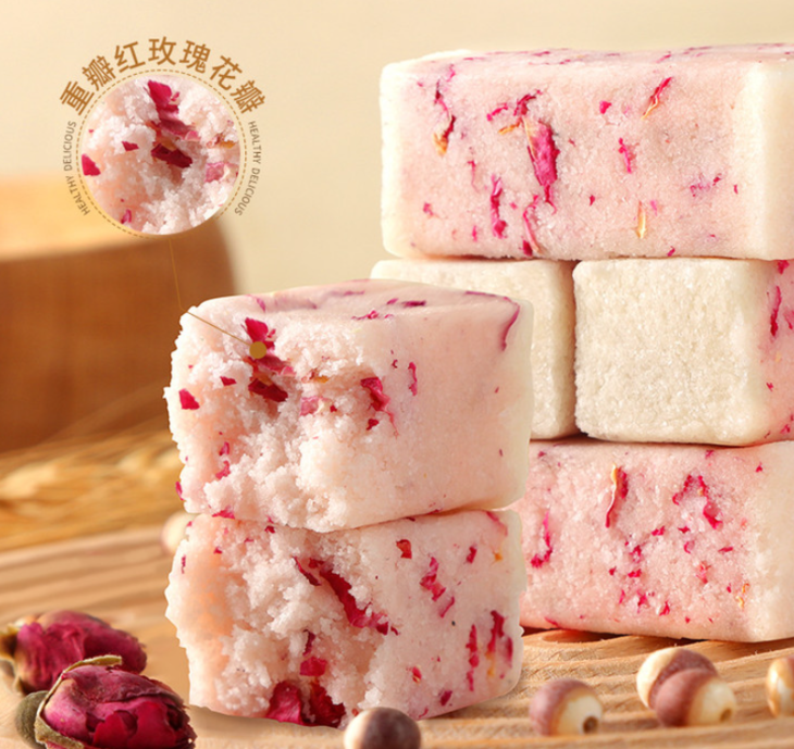 净白的芡实粉混着糯米粉,将碾碎的冰糖、与玫瑰花瓣夹杂中间,看着特别的美丽漂亮,让人看一眼就知道特别好吃。