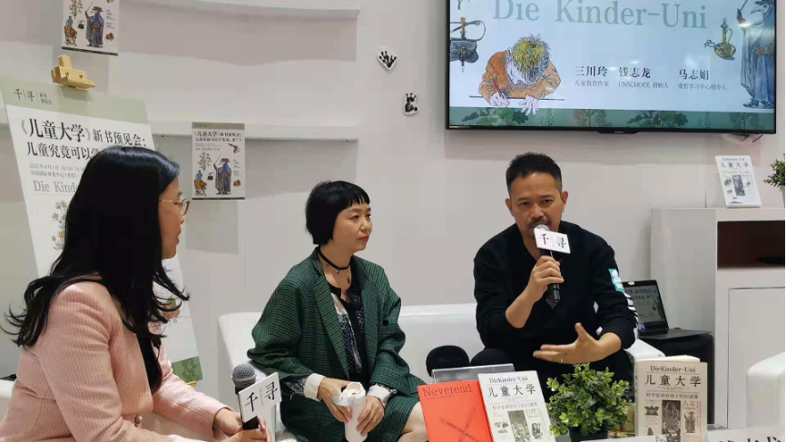 由千寻Neverend主办的《儿童大学》新书预见会:“儿童究竟可以学多深,多广?”现场。从左到右依次为爱哲学习中心创办人马志娟、儿童教育作家三川玲、UNSCHOOL创始人钱志龙。