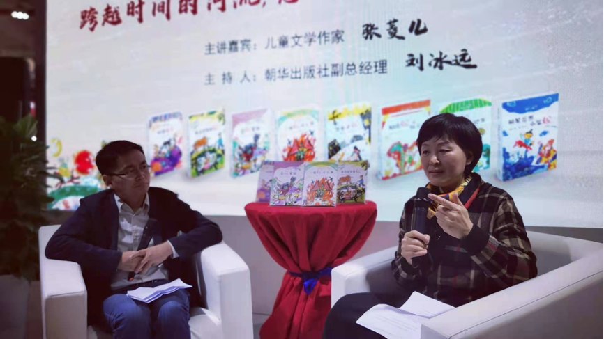 主题为“跨越时间的河流,感受中华民俗文化之美”的“老神仙”系列新书分享会由朝华出版社举办。图为朝华出版社副总编辑刘冰远和儿童文学作家张菱儿(右)。