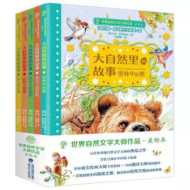 《大自然里的故事》世界自然文学大师作品·美绘本(全五册),[俄]康·帕乌斯托夫斯基、[俄]维·比安基、[俄]米·普里什文等著,[俄]伊·茨冈诺夫绘,沈念驹、石雨晴译,福建少年儿童出版社2020年6月版。