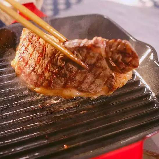 一个铸铁条纹煎锅,热度均匀烘烤着每一个牛肉细胞,烙下一条条清晰的纹路。高温让谷饲牛肉的浓郁奶香充分释放,再撒上新鲜研磨的海盐与黑胡椒,在味觉之前,嗅觉先来了场盛宴。