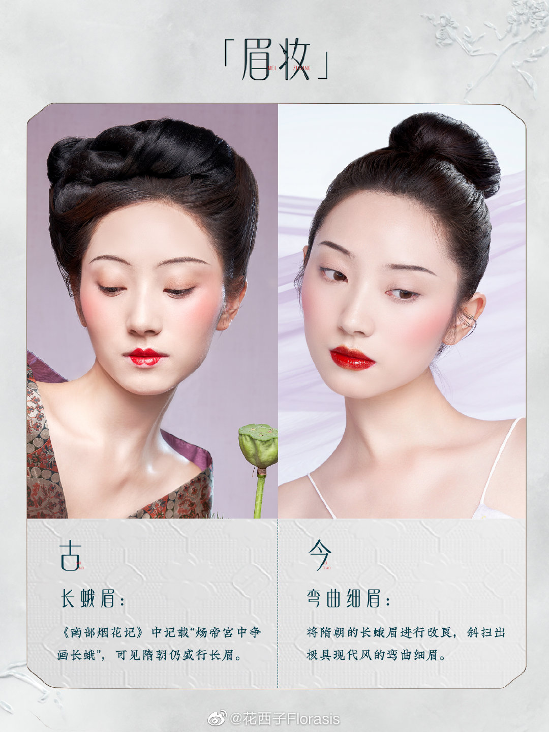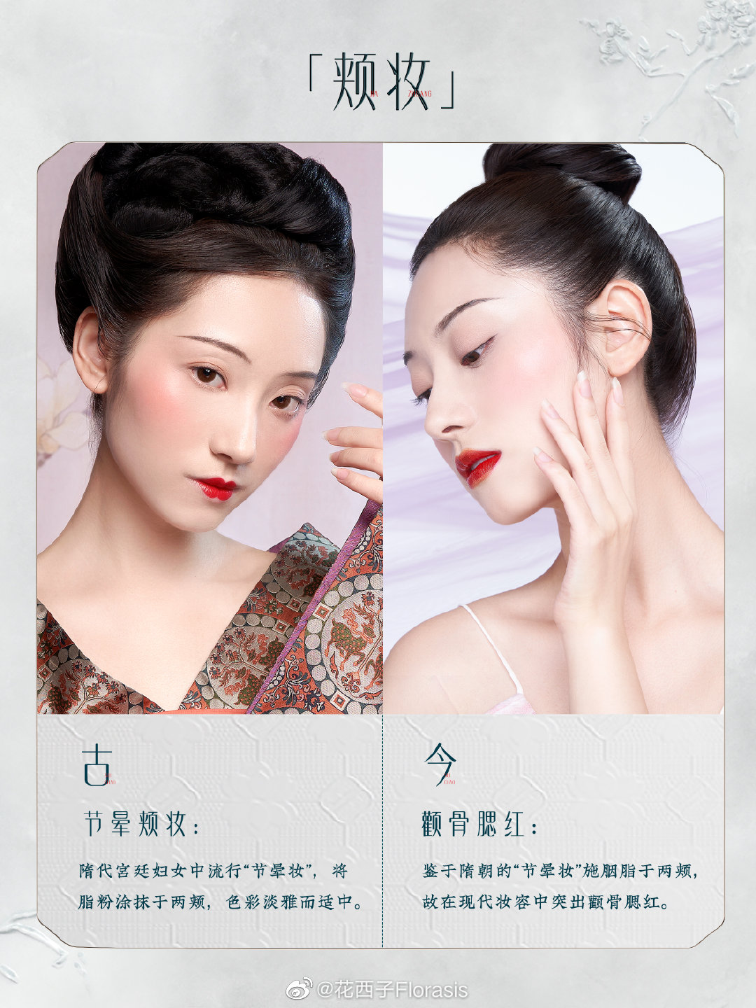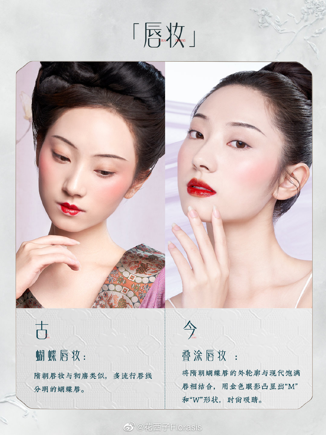 将简约秀丽的隋朝妆容与现代叠涂唇妆、颧骨腮红相结合,时尚高级。