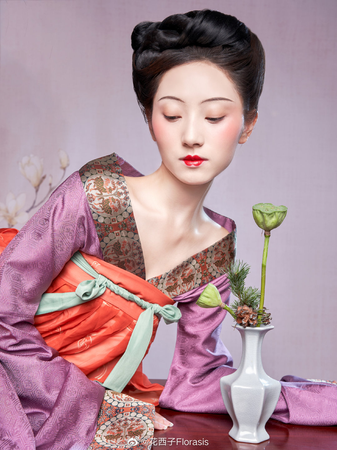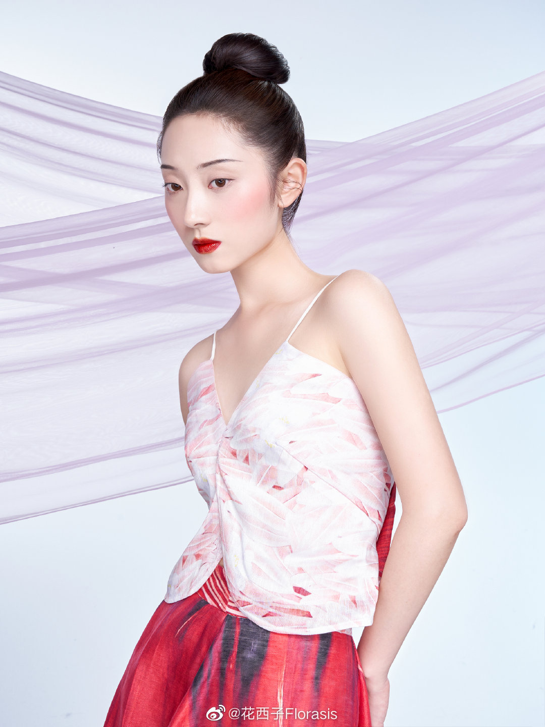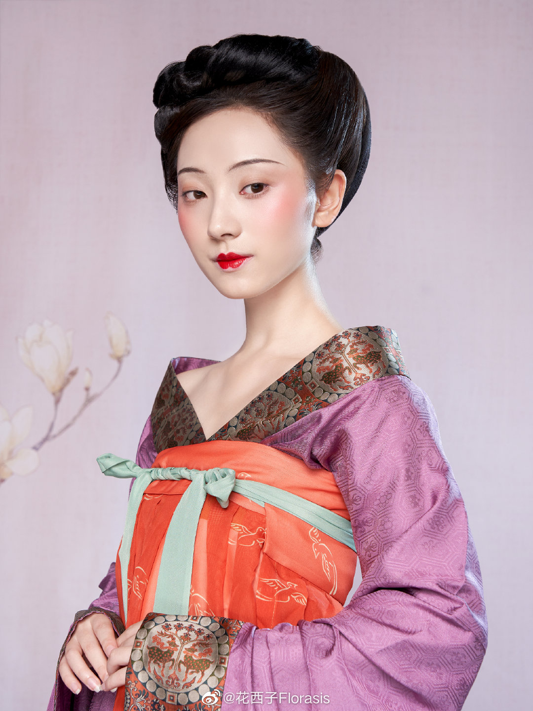 将简约秀丽的隋朝妆容与现代叠涂唇妆、颧骨腮红相结合,时尚高级。