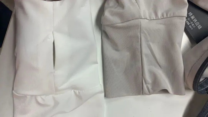 指缝处的开口设计,左边的防晒衣明显走线更加细密,看着也更加顺滑。