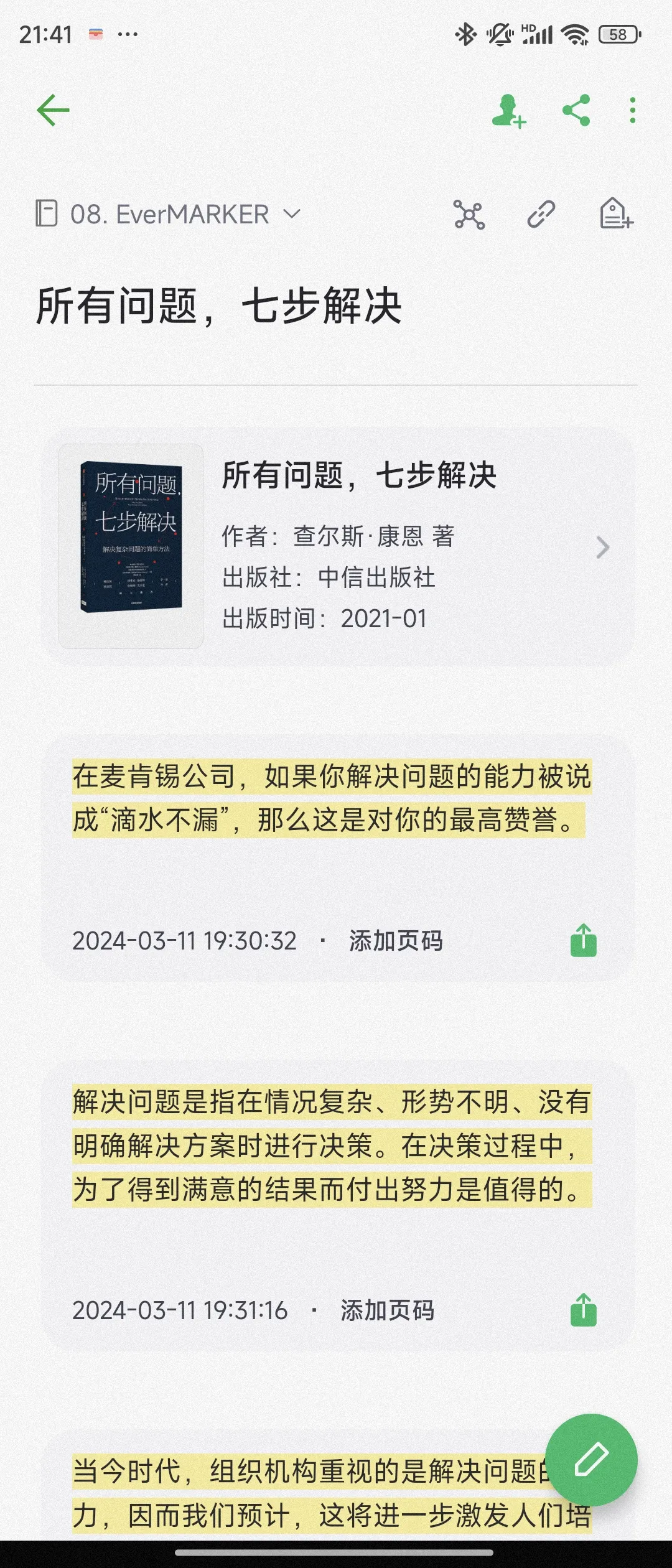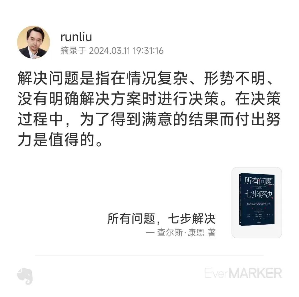 比如,我很喜欢的一本书《所有问题,七步解决》。这本书讲麦肯锡的七步法。写得很好。可是,我在得到APP,和微信读书上,都没找到这本书的电子版。那是不是这本书的“划线”,就没法同步到印象笔记去了呢?