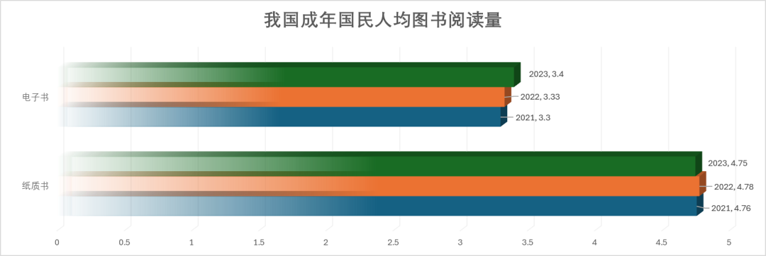 根据中国新闻出版研究院发布的《全国国民阅读调查》结果显示,我国成年国民,2023年人均阅读纸质书4.75本,电子书3.4本。