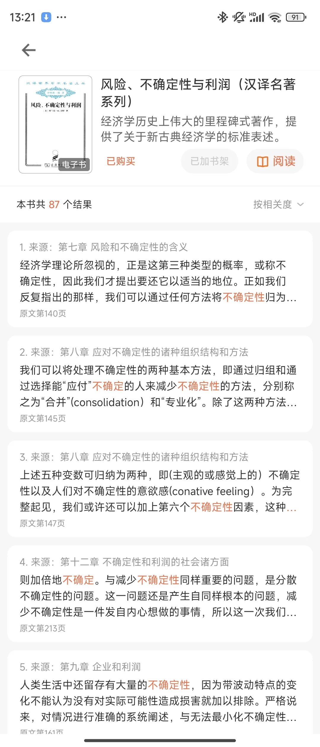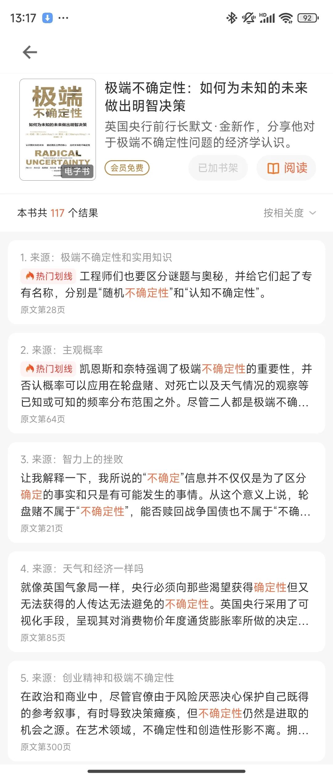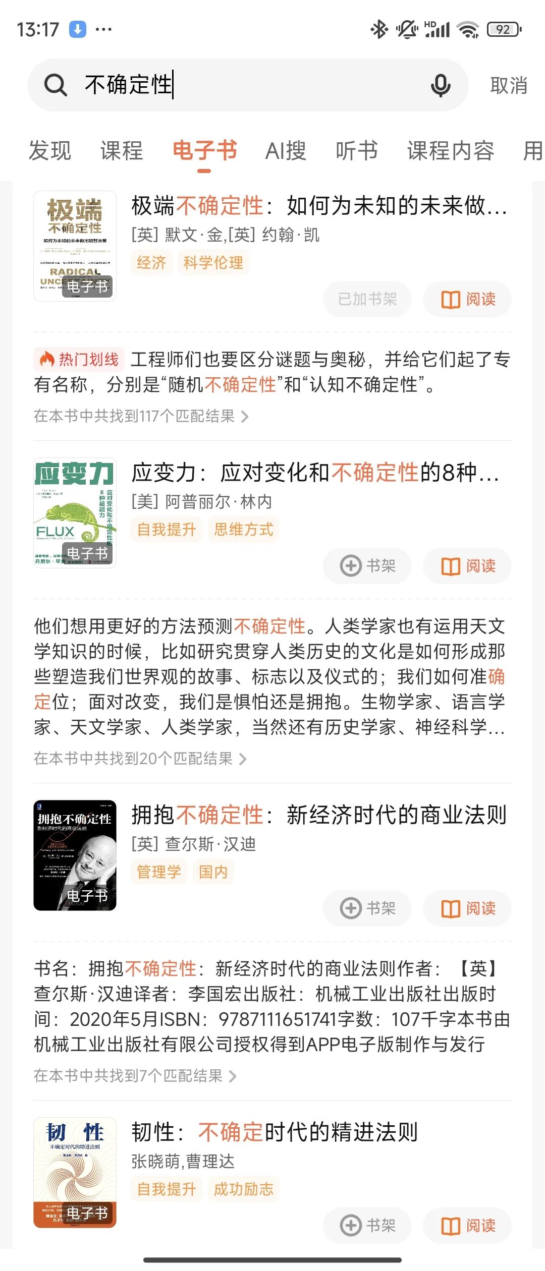 于是,我打开了“得到APP”。在搜索框里,输入了“不确定性”这四个字。感谢电子书平台现在越来越强大的搜索功能。瞬间,出来了几十本书。甚至标明了这些书,哪些章节,哪些段落,哪些句子提到了“不确定性”。