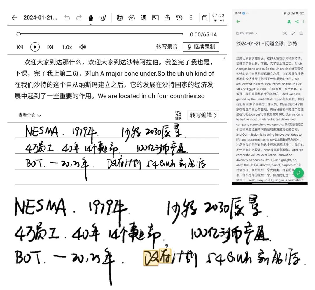 今年1月份去沙特。嘉宾一边用英文语音分享,我一边在会议本上,用中文记笔记。会议结束后,整个会议记录(语音记录,转写文稿,手写笔记),都同步到了印象笔记。