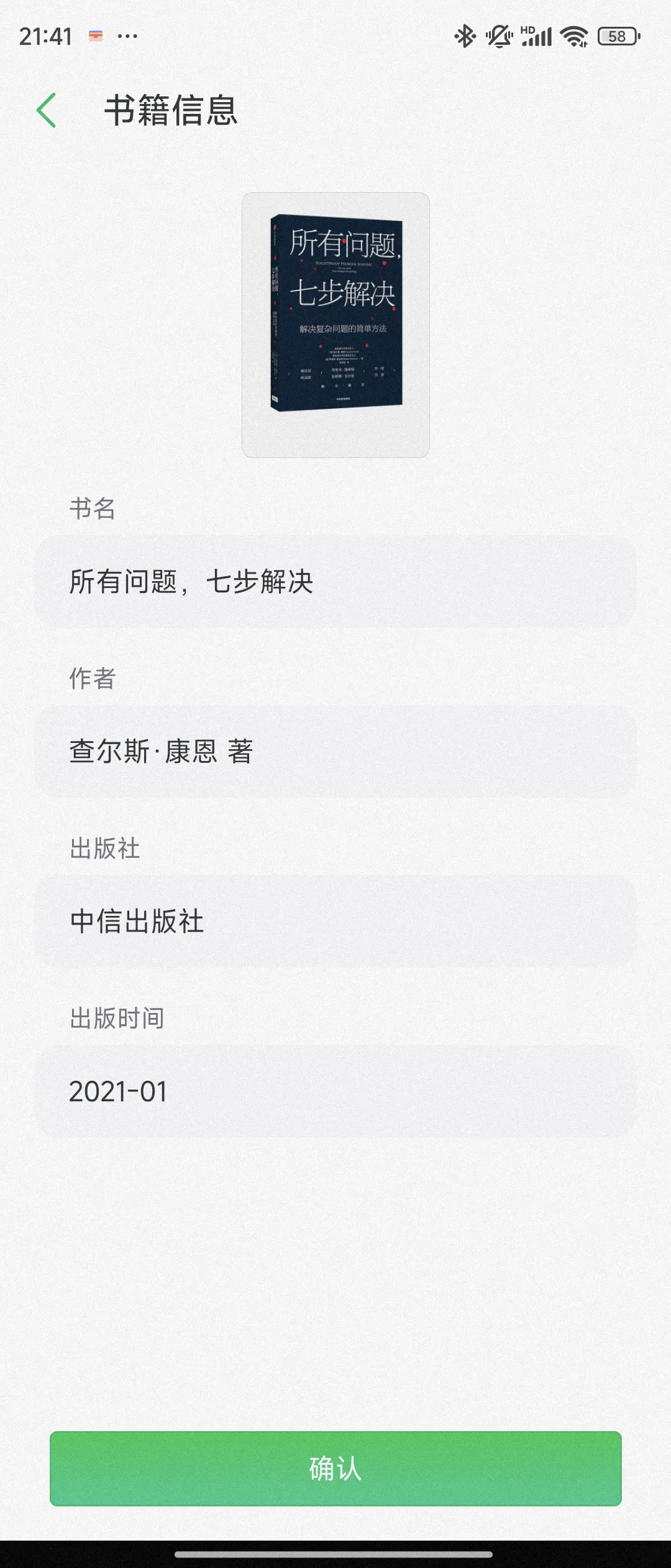 我用手机里的“印象笔记APP”,拍了一下《所有问题,七步解决》这本书背后的条形码。然后,一篇空白的笔记文件,就被建出来了。更厉害的是,这本书的封面图,作者,出版社,出版时间,都自动同步到了这个笔记文件里。