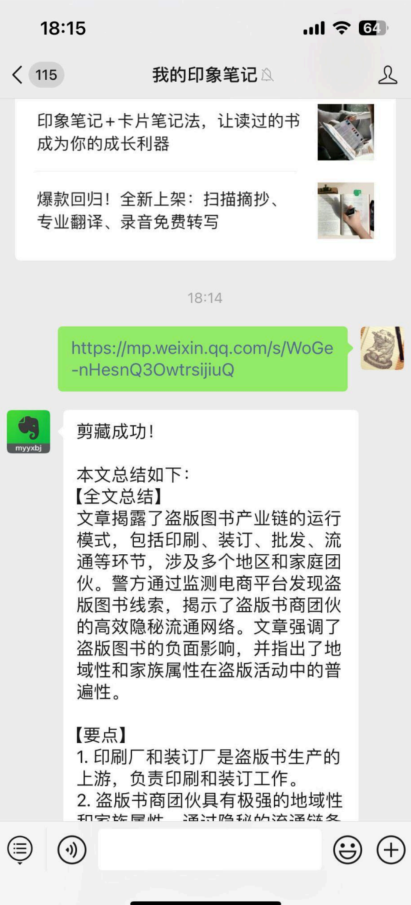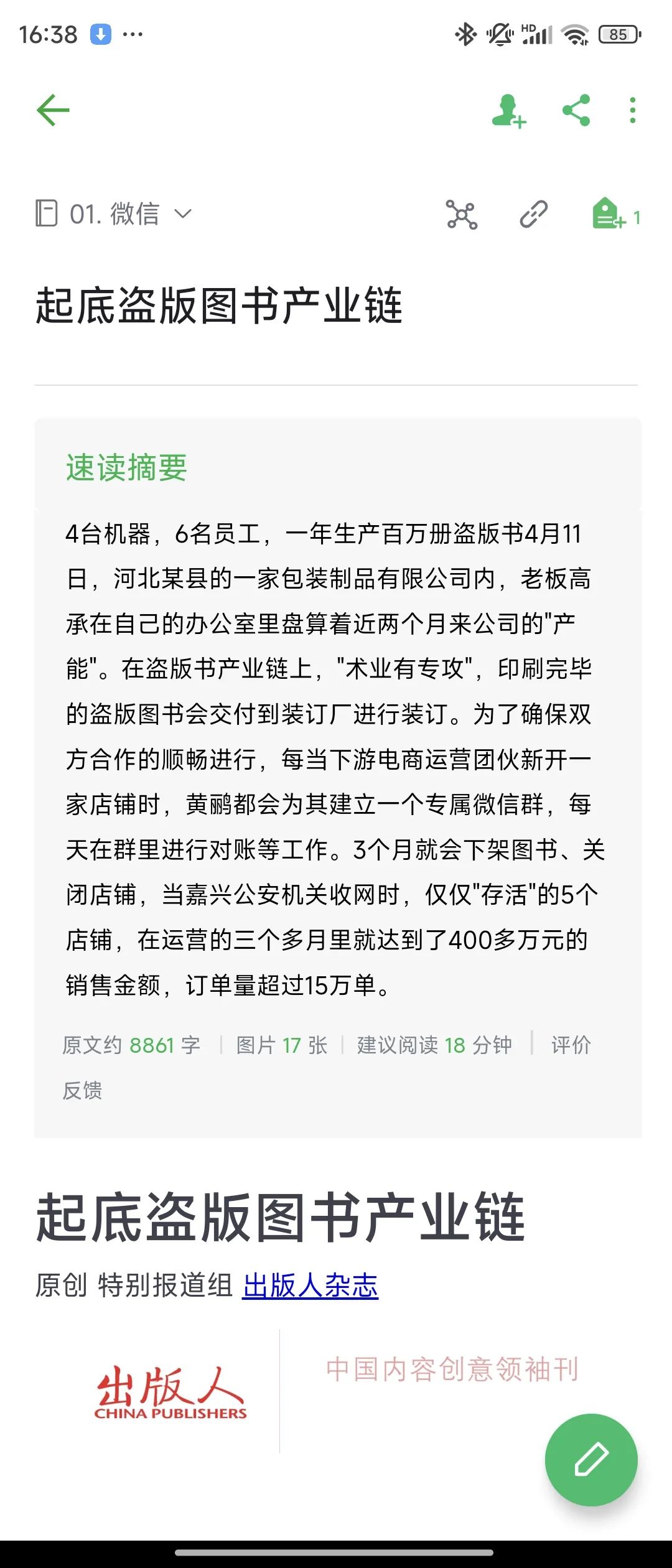 有一次,我看到“出版人杂志”公众号发的一篇文章,叫《起底盗版图书产业链》。深受震撼。原来盗版图书,不是小作坊,而是一个环环相扣的大产业。这篇文章里,有很多细节和数据。我想收藏这篇文章。怎么办?