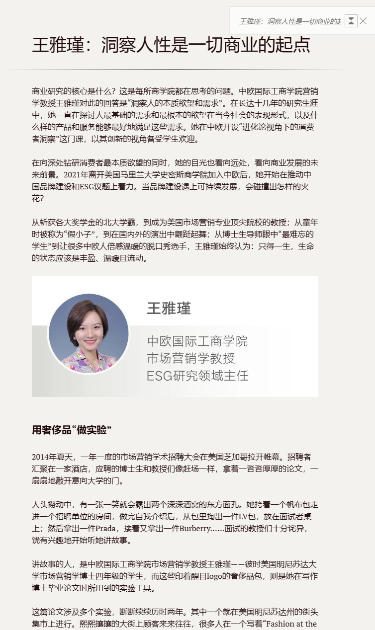 很多文章,都给我启发。尤其是,中欧商学院王雅瑾教授的洞察,尤为深刻。她说:商业研究的核心就是对人的洞察,是对人性最底层的理解和偏好的捕捉。嗯。这篇文章,要“输入”到我的“第二大脑”里。怎么输入?