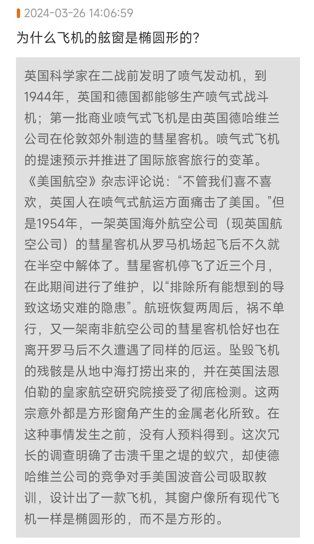 椭圆形的飞机舷窗,不是为了美观,而是为了安全。原来如此。有意思。于是我在这个案例下面,用手指划了条线。
