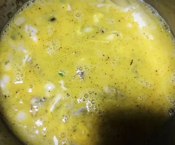 3、小香葱切末,和蛎蝗一起放入鸡蛋液中,搅拌均匀;