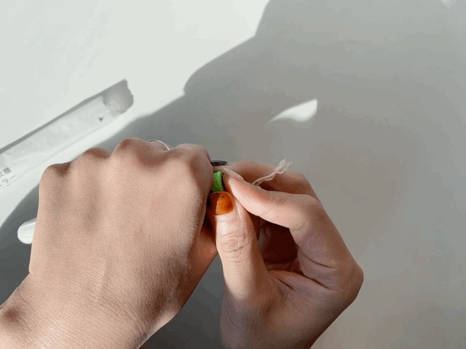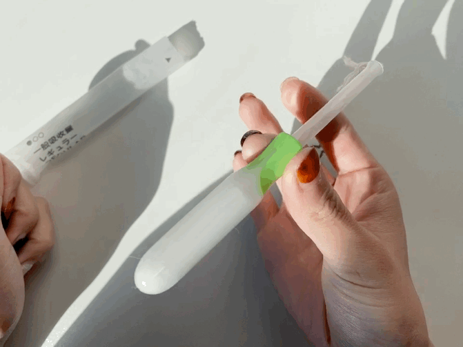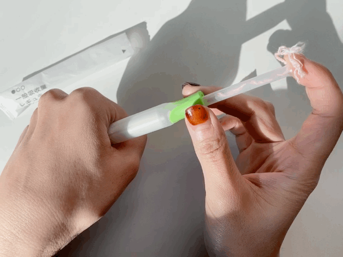 第四步:用食指推动推杆将棉芯全部推出,再顺势把导管抽出来丢掉。棉线会自动垂落在V道口外。当我们想取出棉条时,只需要拉棉线就可以了。