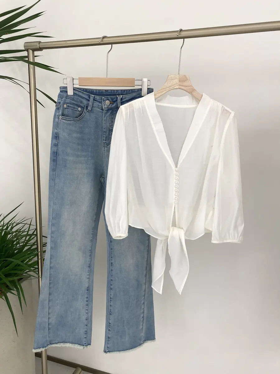 想要更时尚休闲一些可以搭配牛仔喇叭裤,会更有法式韵味