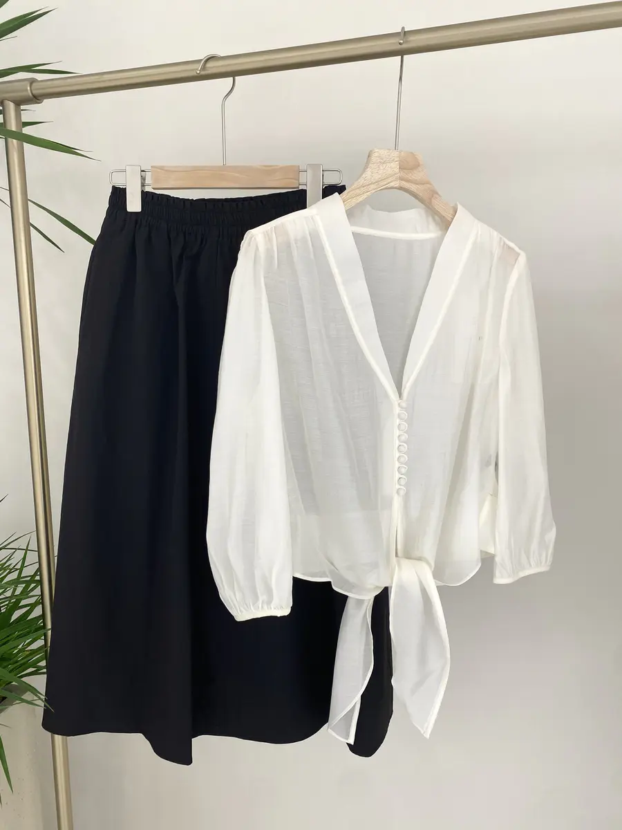 因为是属于比较优雅通勤感的衬衫,可以搭配黑色的半身裙去穿着