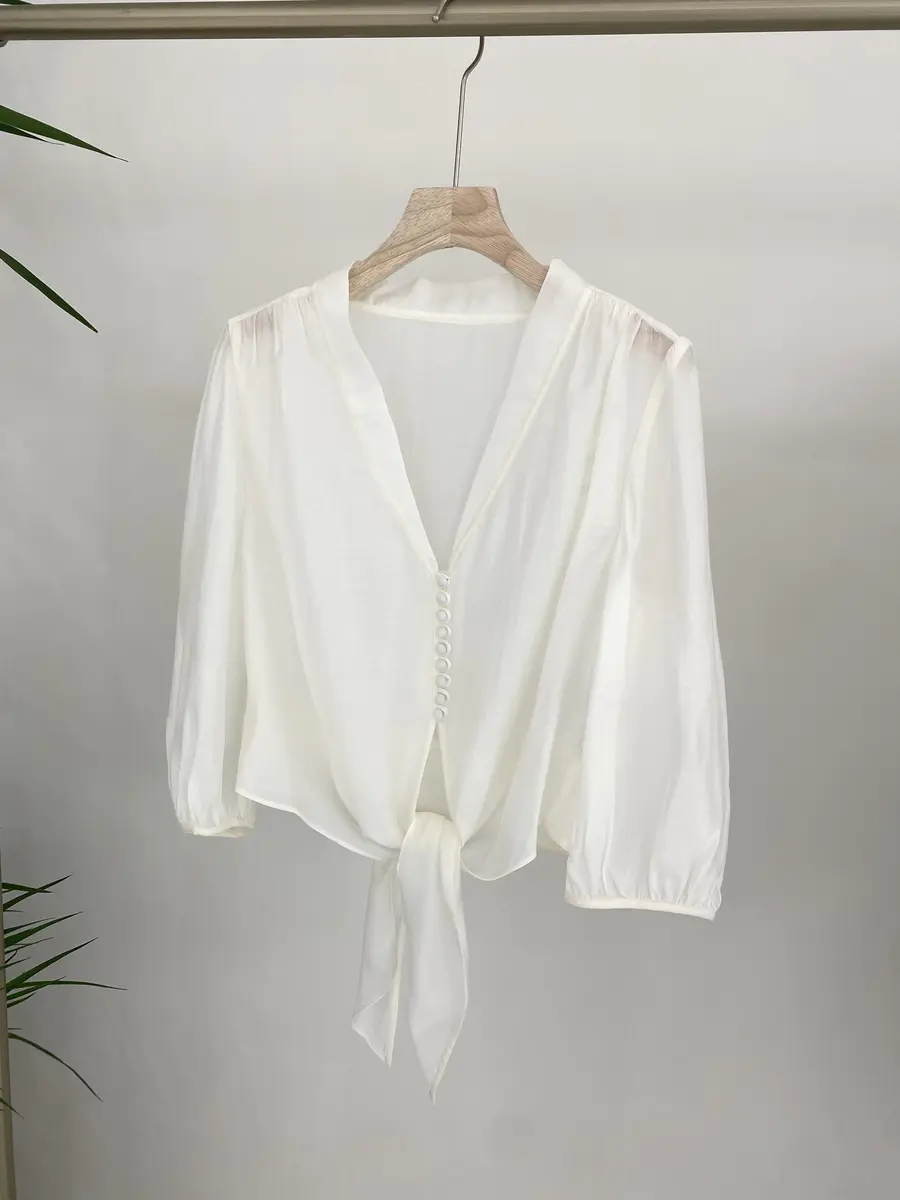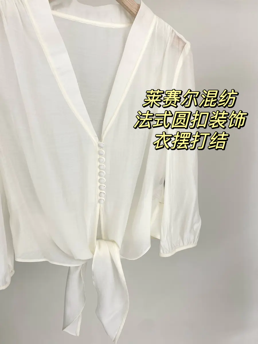 整体设计主要采用法式衬衫的感觉,大v领打造慵懒,点缀本部圆扣作为装饰,下摆采用打结设计,会更显女人味~