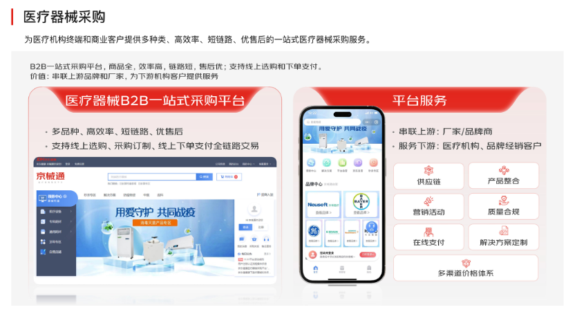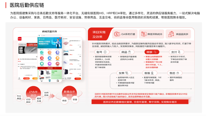 阿里健康通过“云基建”战略,提供医疗大模型、药品追溯系统“码上放心”、数字化医疗解决方案等服务,旨在提升医院的诊疗能力、患者管理水平和药品安全性。京东健康的数字化服务亦提供类似服务,但京东健康更为亮眼的地方在于更专注供应链的赋能。京东健康利用其强大的供应链管理和物流体系,为医院提供高效的药品采购、配送和库存管理服务。通过与医药、医疗器械等企业的合作,京东健康建立了完善的供应链体系,确保药品和医疗器械的及时供应,特别是在冷链药品的配送方面表现突出。