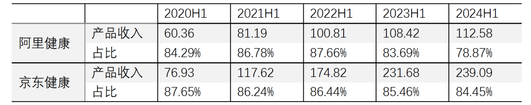 从二者近5年的半年报来看,在药品零售的收入占比上,京东健康常年保持在85%左右或者以上,而阿里健康今年跌破了80%。由此可以看出在药品零售端,消费者更倾向于以“用药时效性”为导向。