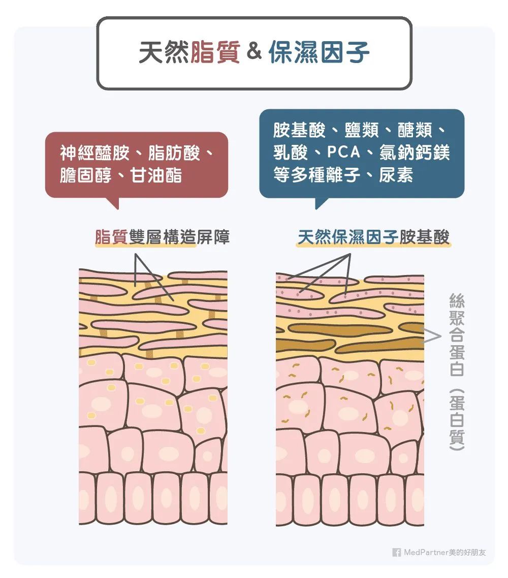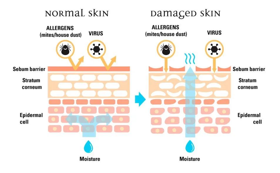 我们知道健康皮肤是“易守难攻”(易守自身水分,异物难攻皮肤防御),而受损皮肤则“大门常开”,水分流失导致皮肤干燥、异物进入皮肤引起免疫反应。