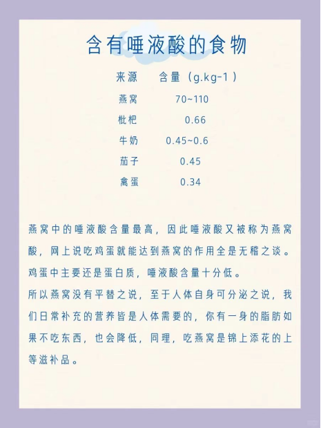 虽然日常的鸡蛋、牛奶等都含有唾液酸,但含量远不如燕窝。
