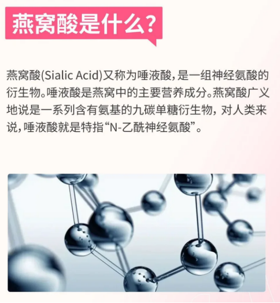 至今已经发现超过50多种的唾液酸,而我们所知的“N-乙酰基神经氨酸”是分布最广,也就是人体及燕窝含有的唾液酸。