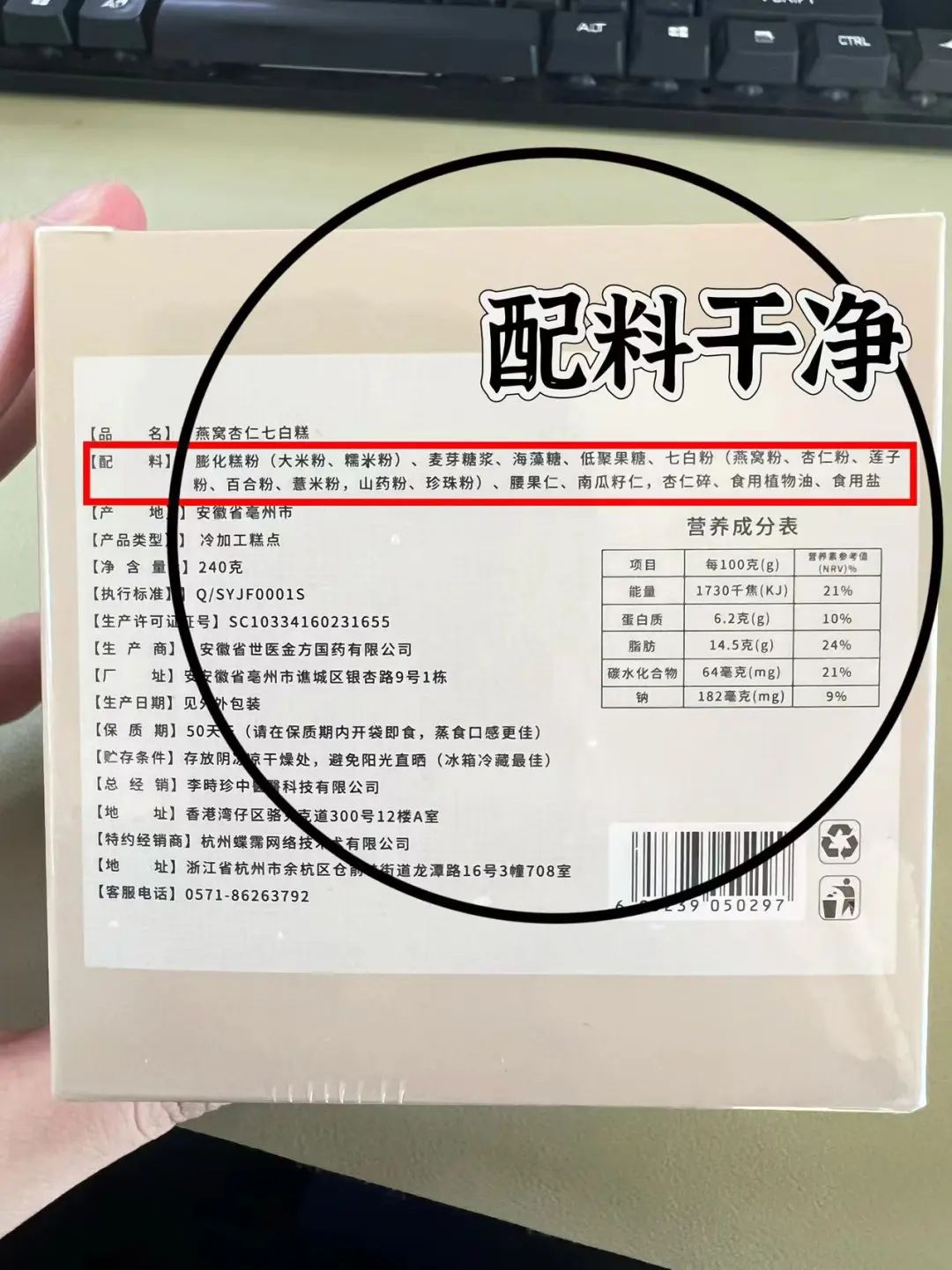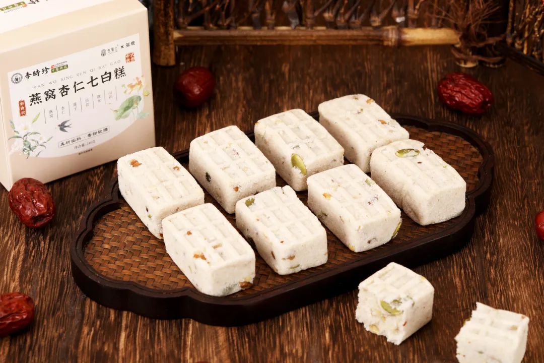 小来当然不能落后潮流,这不经过多次调查对比,给大家选出来了这款李时珍出品的【田陌上燕窝杏仁七白糕】!