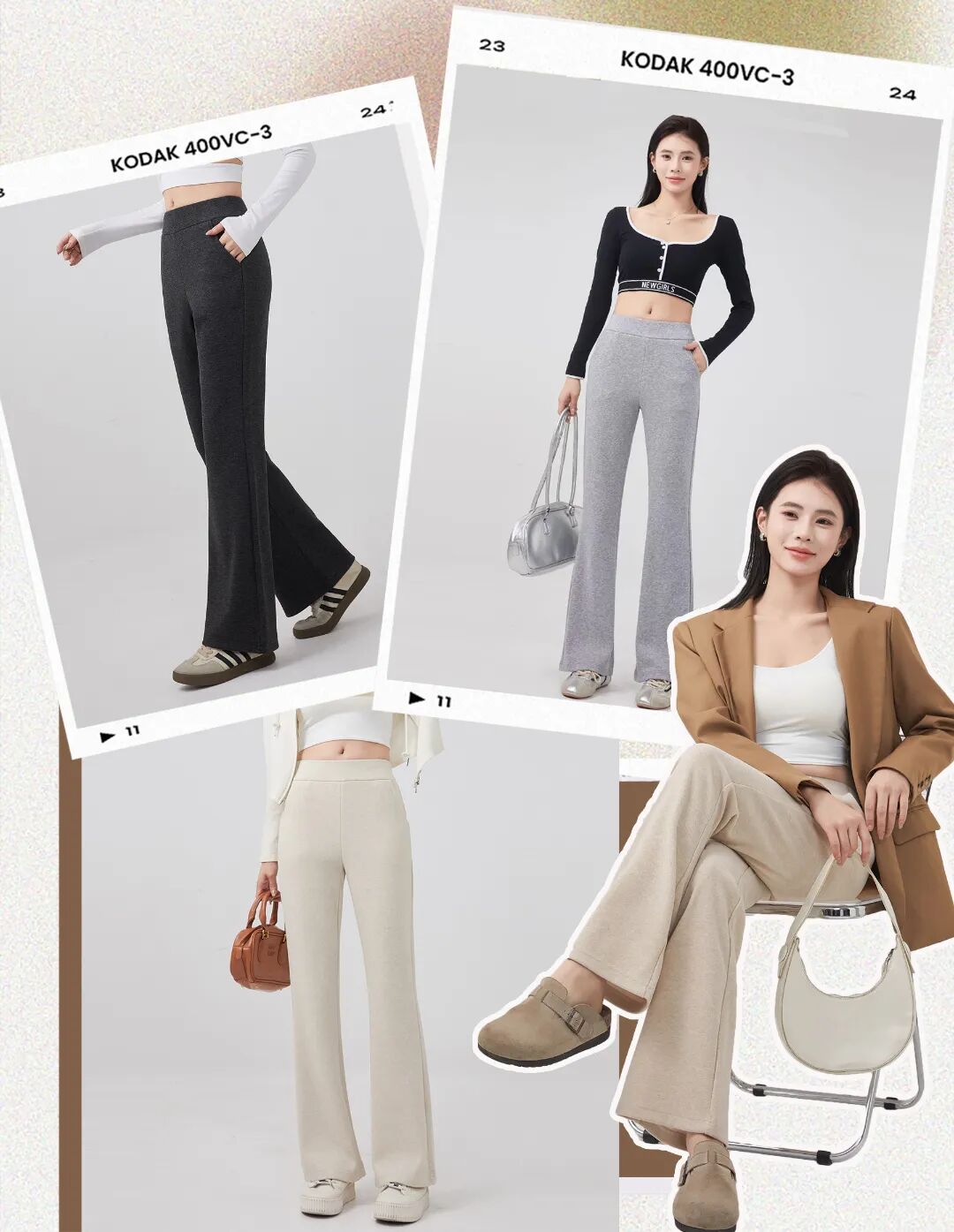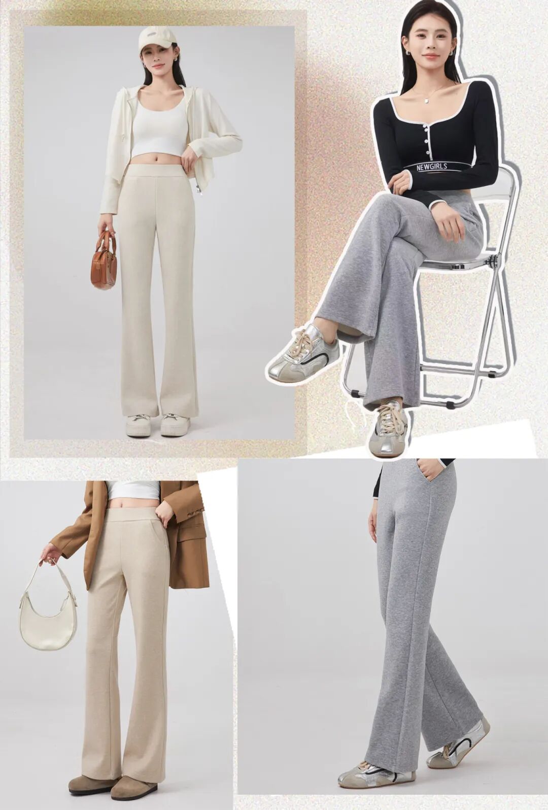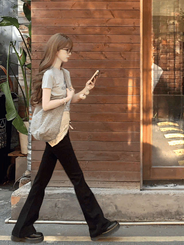 想修饰身形,其实更适合微喇裤这种“正三角”裤型,视觉重心往下移,裤脚悄悄放开,胯宽瞬间被平衡,整个人都显得轻盈舒展啦。