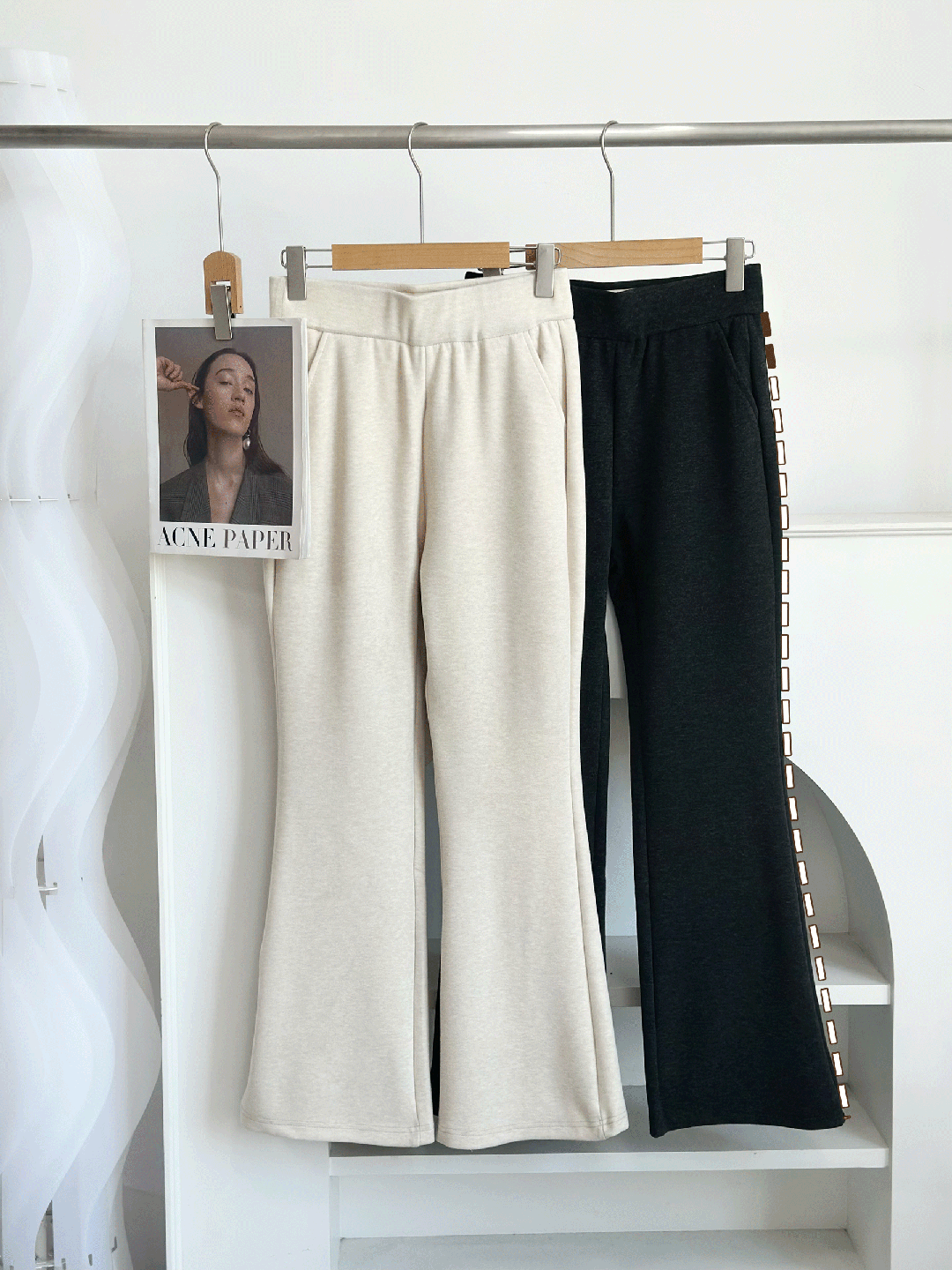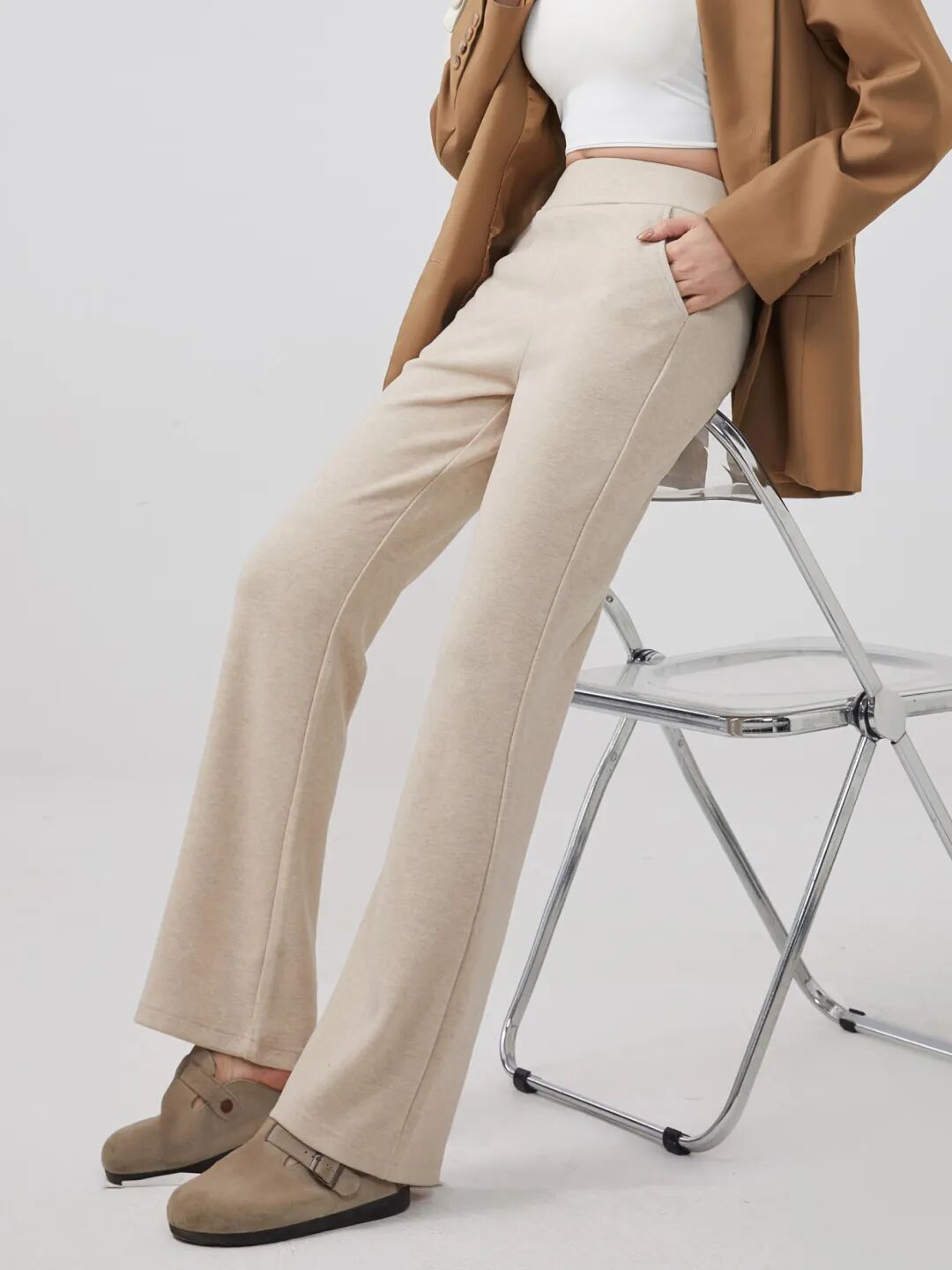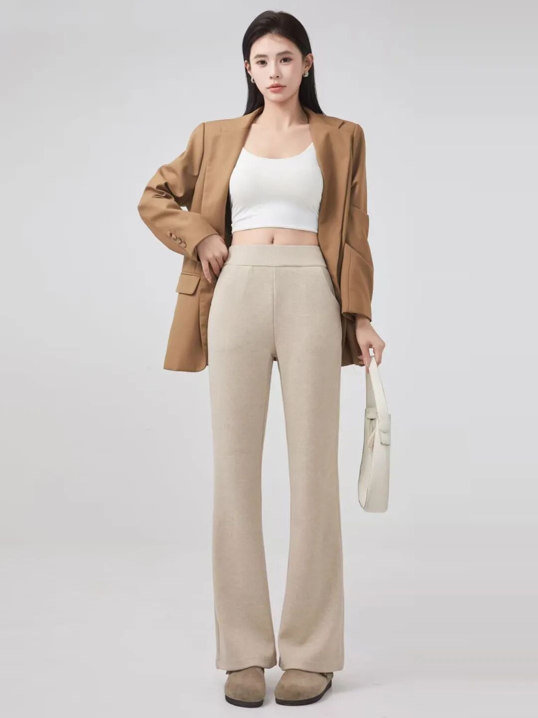 裤子上半截是修身直筒,“喇叭口”从膝盖开始悄悄外扩,散开一道温柔弧线。