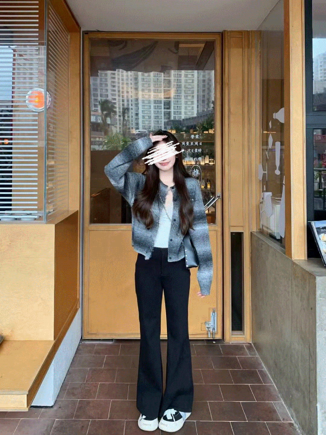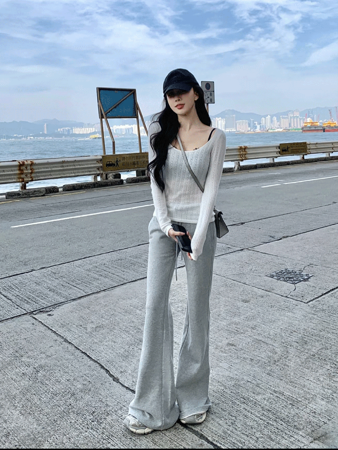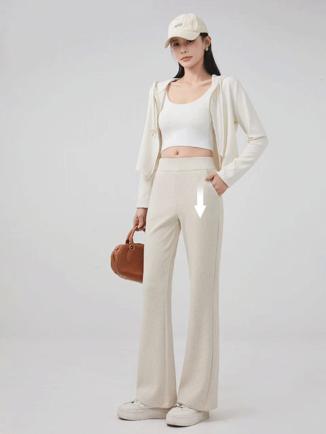 裤子的长度也经过精心设计,搭到脚面,暗戳戳拉长腿型。
