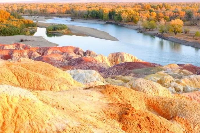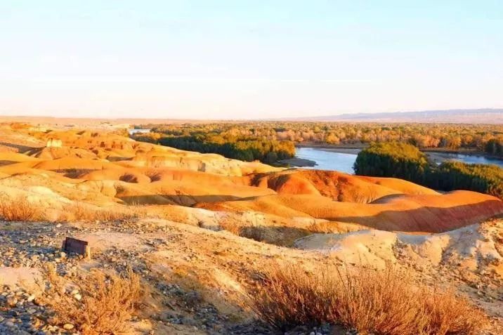 它毗邻碧波荡漾的额尔齐斯河,对岸葱郁青翠的河谷风光遥相辉映,沟壑纵横的雅丹地貌,在夕阳光线角度不断变换中变幻着颜色。