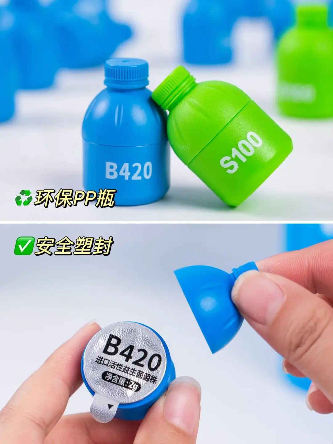 还是环保pp瓶的活性舱设计,隔氧、隔水、隔光!避免被空气、水分、胃酸破坏,好菌“准时达”!