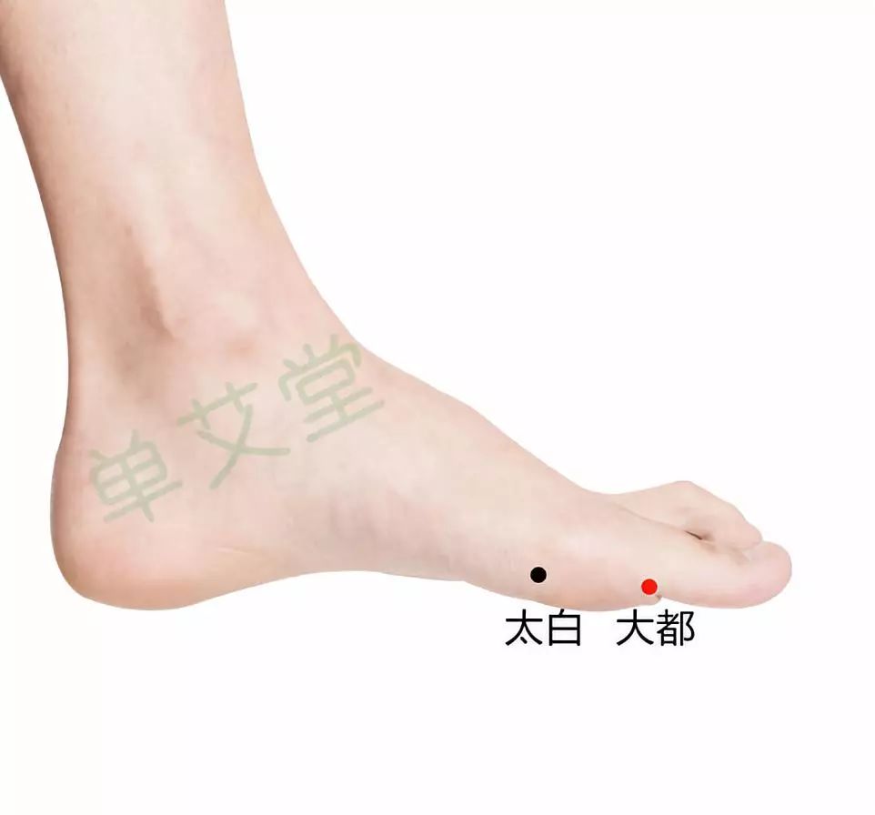 太白穴:太白穴集脾经的原穴与腧穴于一身,灸疗此穴,具有健脾益气、祛湿止泻、消食化滞等功效。