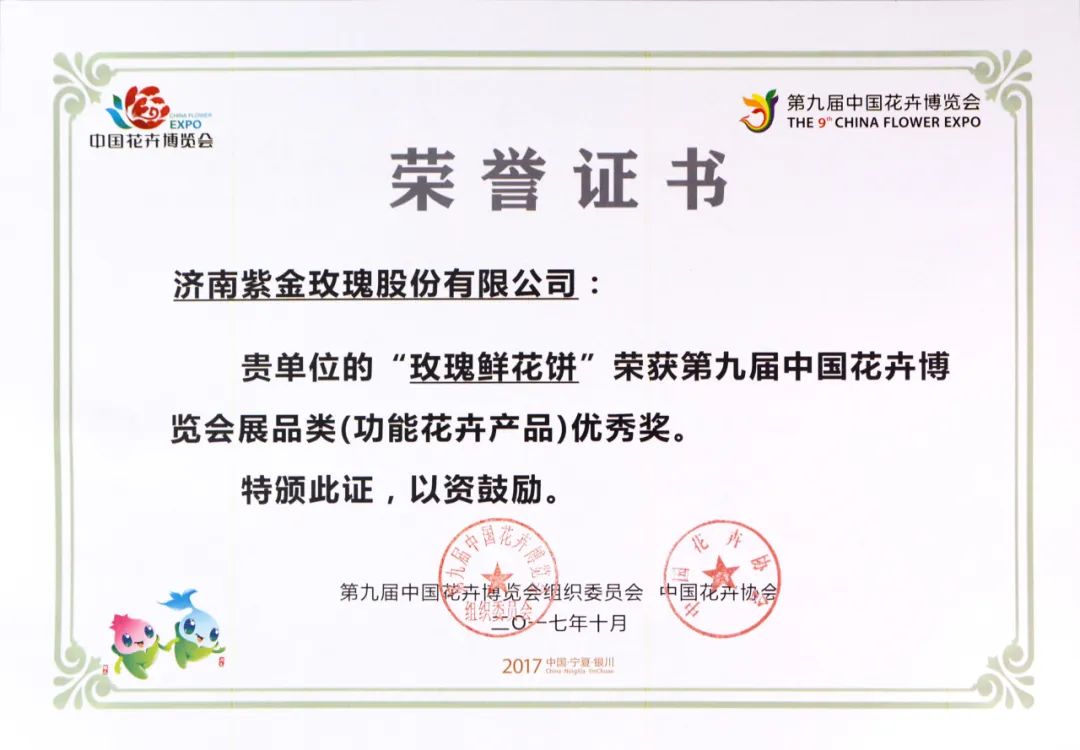 2017年10月 荣获第九届中国花卉博览会展品类(功能花卉产品)优秀奖