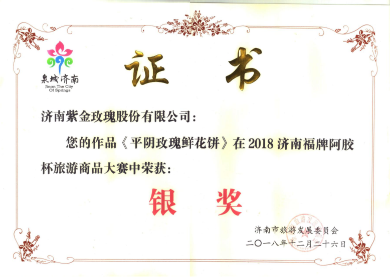 2018年12月 在2018济南福牌阿胶杯旅游商品大赛中荣获银奖