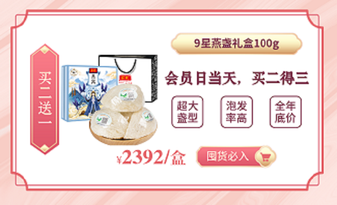 买二送一?从未有过这是第一次,媲美618提前开启!马来西亚精品9星大燕盏豪华100g大礼盒,盏型更饱满燕丝更粗,燕酸浓度更高,送人自食高端实惠不失尊贵范。原价4600,会员价3588,31号当天参与活动,买两件发三件,到手价每件2392。时间定于5月31号00:00-24:00,当天会员日,9星燕窝限时一天,每个ID限购6件多买不发,买二发三,高端豪华 燕窝礼盒,到手价仅2392。懂的人都懂,尽享低调价格中的的实惠,豪华内敛中的奢华。