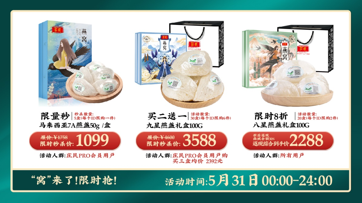 这次活动7A燕盏50g装原价1758元,这次针对pro会员用户给予宠粉福利,限量仅5盒,对于常食燕窝的燕窝粉,赶紧定好时钟,等待5月31号上午10点开奖吧!一个ID仅限1件,怕手慢无,叫上爸妈,朋友一起来,先到先得,当天错过就得等下年,还有可能不是1099!
