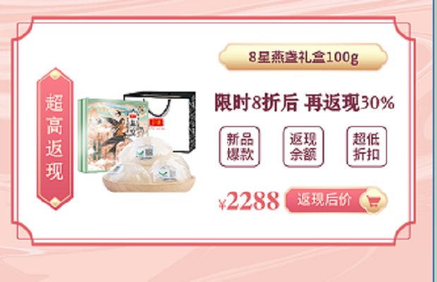 活动产品三、8星燕盏精品100g礼盒限时8折参与返现,到手价仅2288