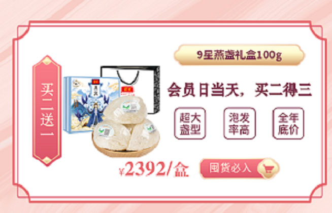 活动产品二、9星精品大燕盏100g豪礼 买二送一到手价仅2392