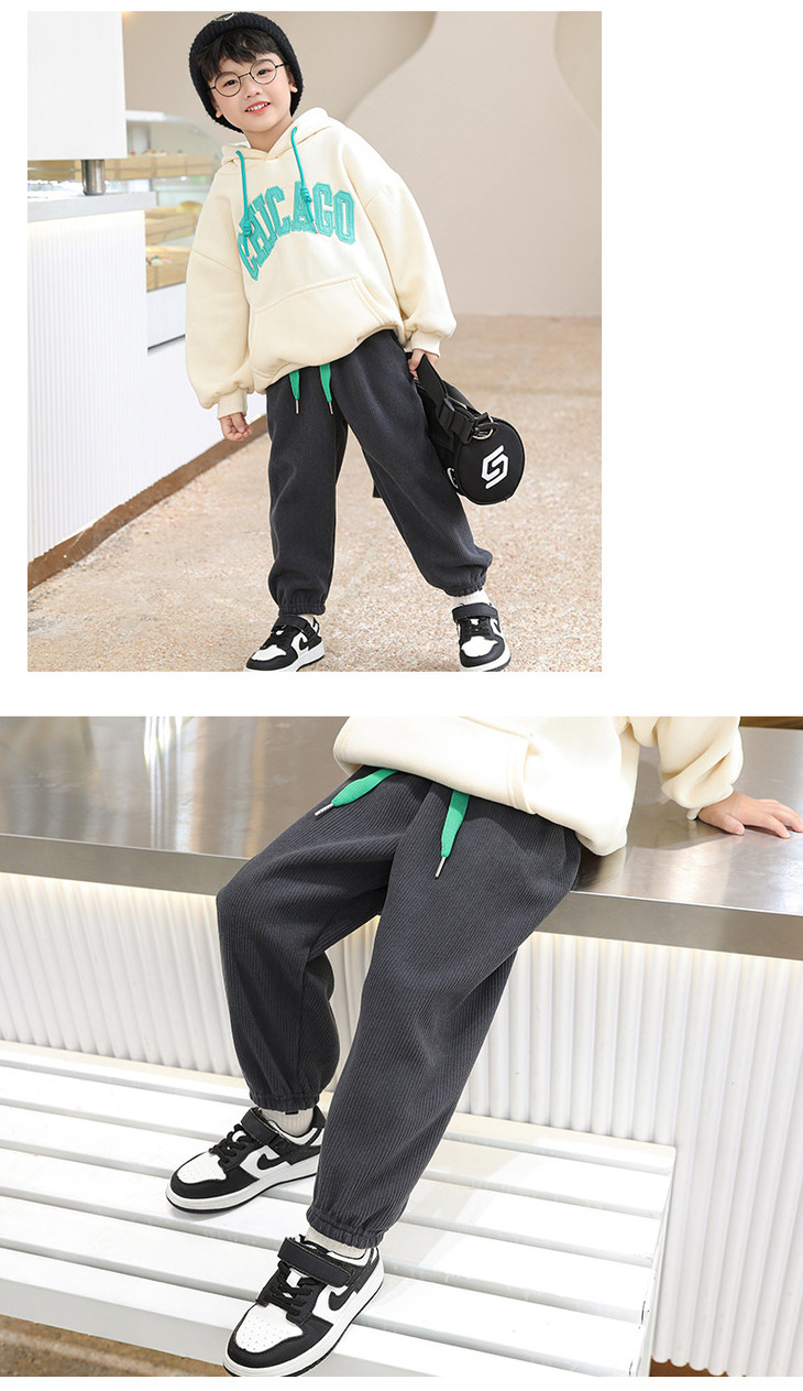 咱们这款加绒款运动裤采用一体绒,不易掉绒而且孩子怎么踢怎么造都非常服帖舒适。