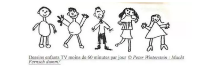 德国儿童心理学家做过一个测试,他们让三组5岁的孩子在纸上画小人。结果,每天几乎不看电视的孩子,画出的小人最完整、最漂亮。